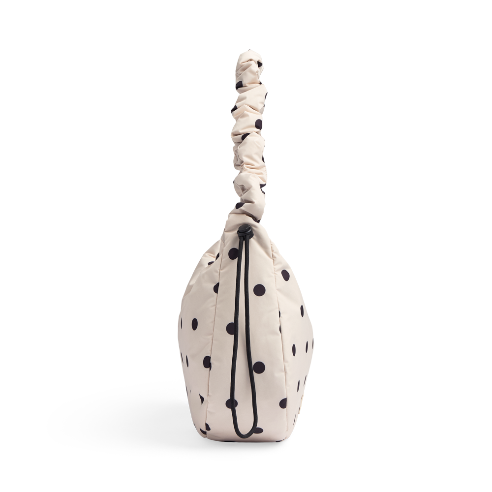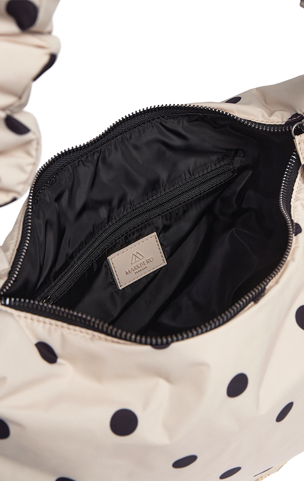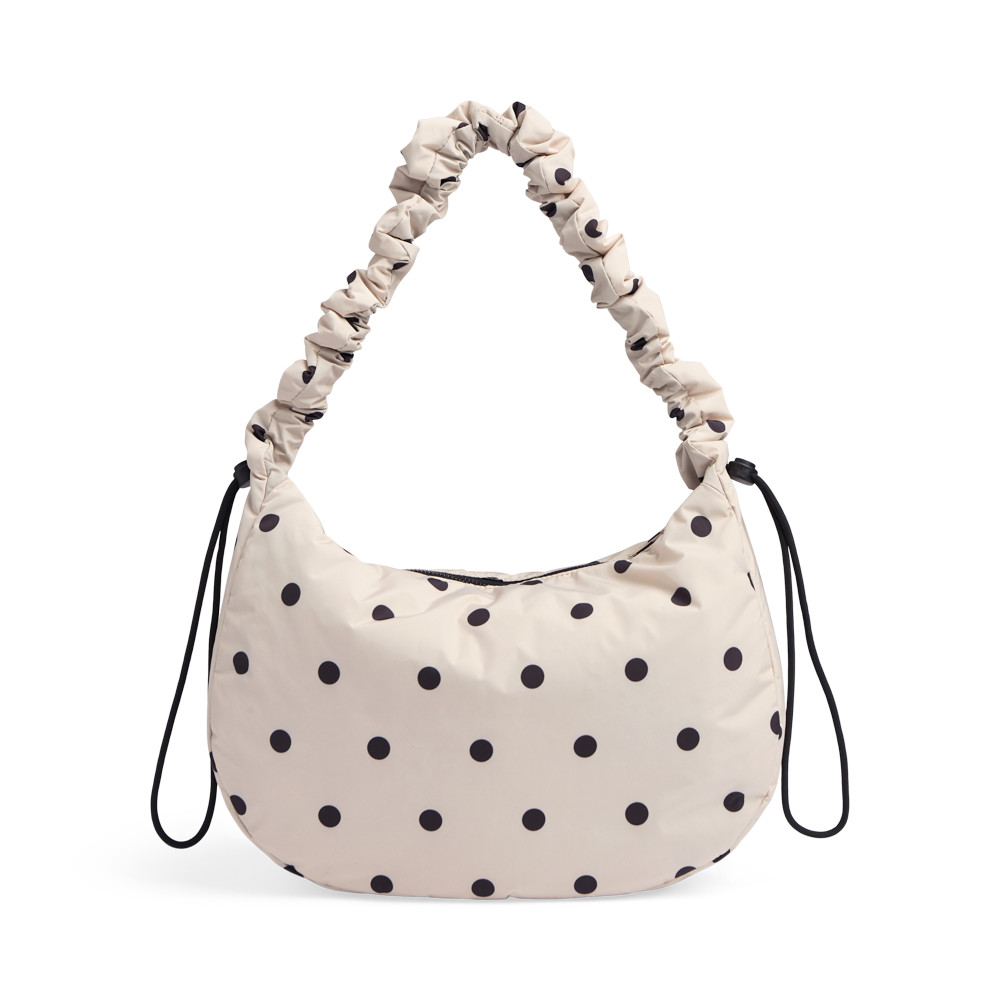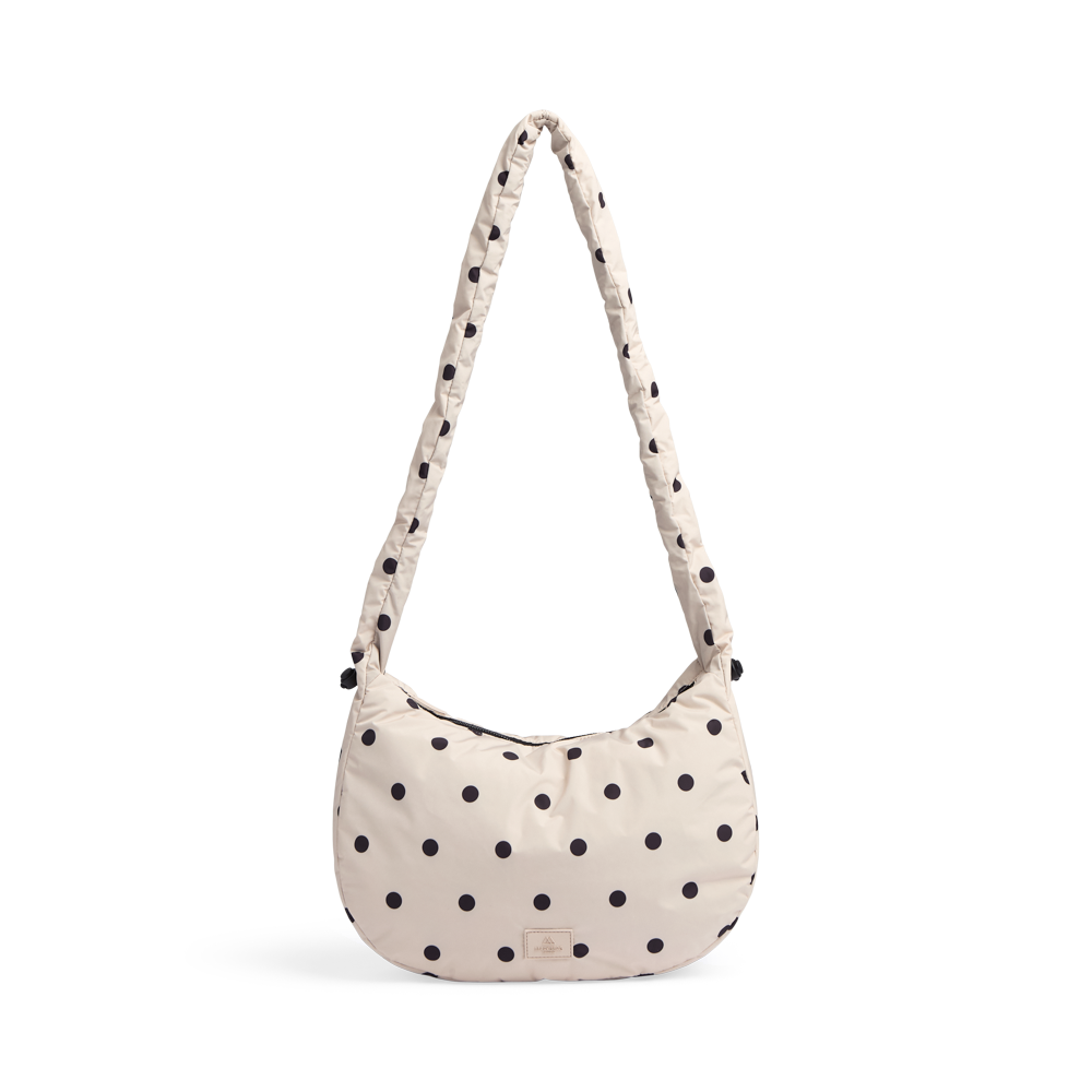 En elegant og legende crossbody med et moderne polka prikker. Kan bruges crossbody eller over skulderen. Den blødt polstrede rem med rynkeeffekt og justerbar snøre giver tasken et unikt og trendy look, mens det klassiske polkaprint tilfører et feminint twist.