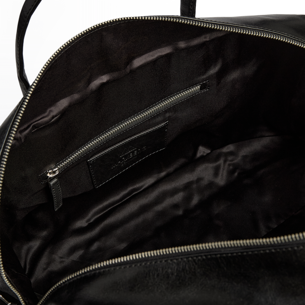 • Stort hovedrum med god plads til tøj og sko • Lynlåslomme indvendigt og lynlåslomme på fronten • Lynlåslomme på bagsiden • Strop på bagsiden til fastgørelse på kuffert • Aftagelig og justerbar skulderrem • To bærehanke • Lukkes med lynlås • Slidstærkt for indvendigt • Læderets struktur og nuance kan variere naturligt og giver tasken et unikt udtry