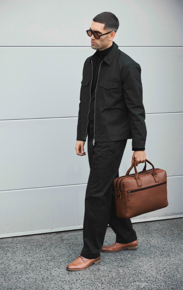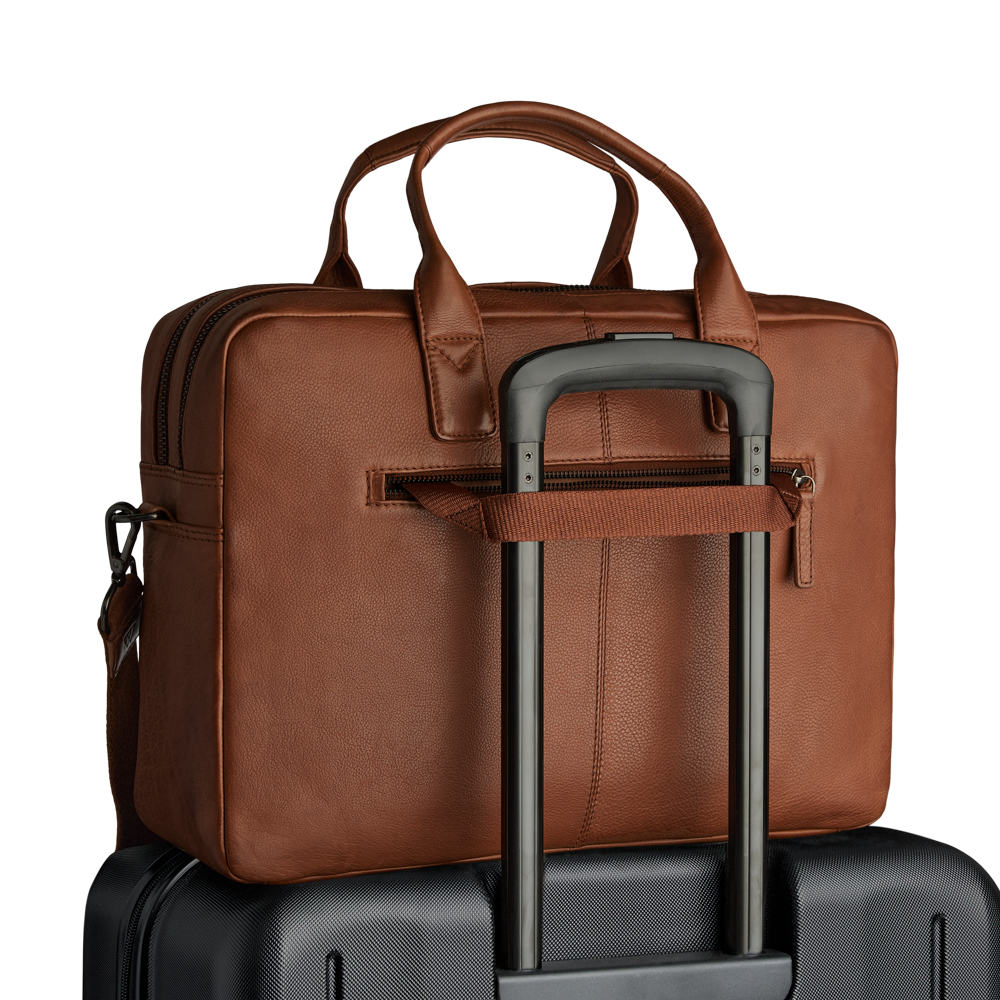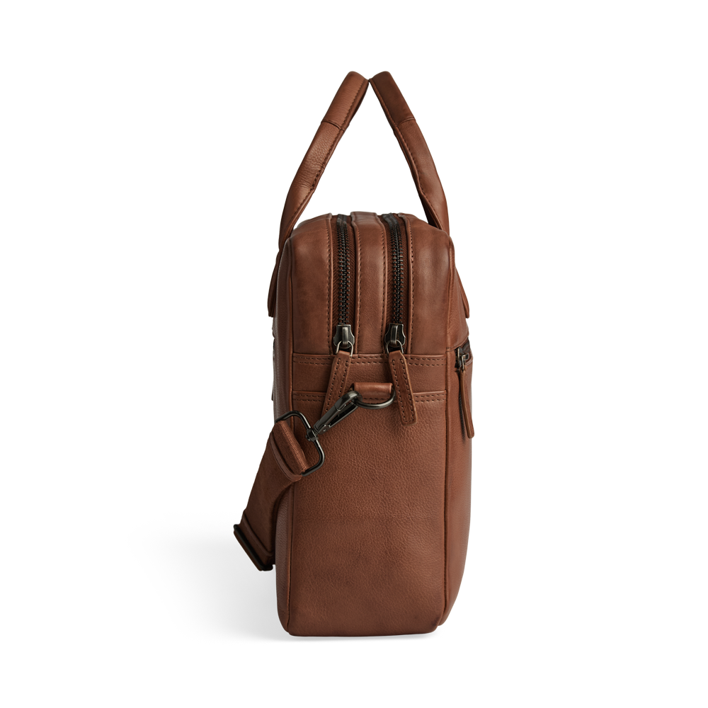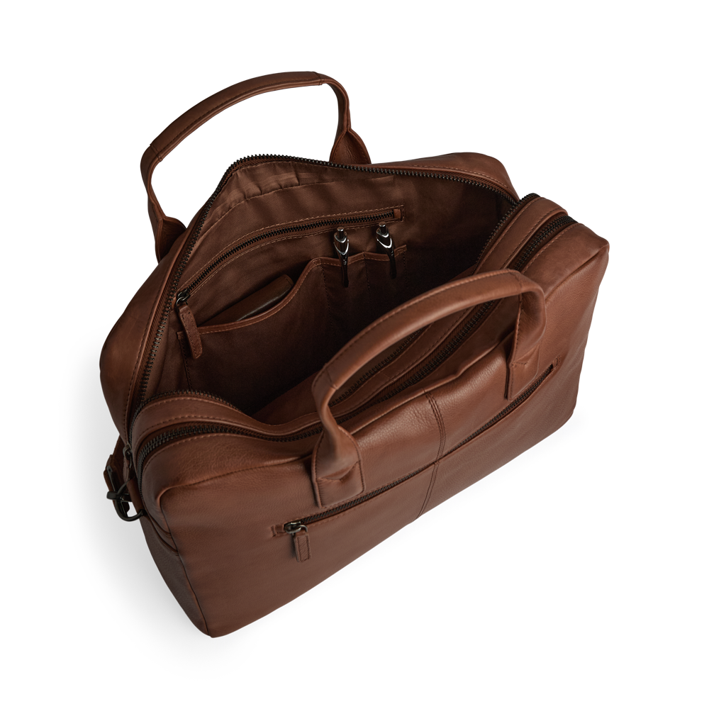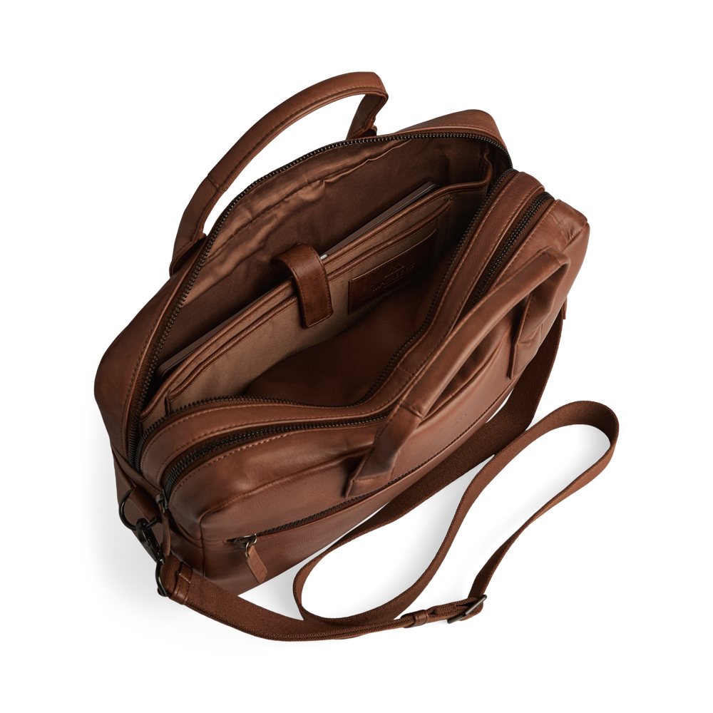 Tidløs og elegant arbejdstaske i blødt kalveskind. De to separate rum gør det nemt at organisere både computer, iPad og dokumenter – perfekt til både arbejde og rejser.