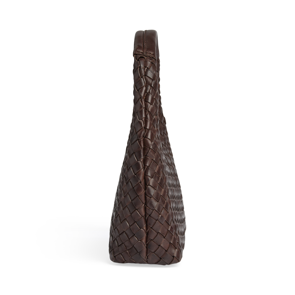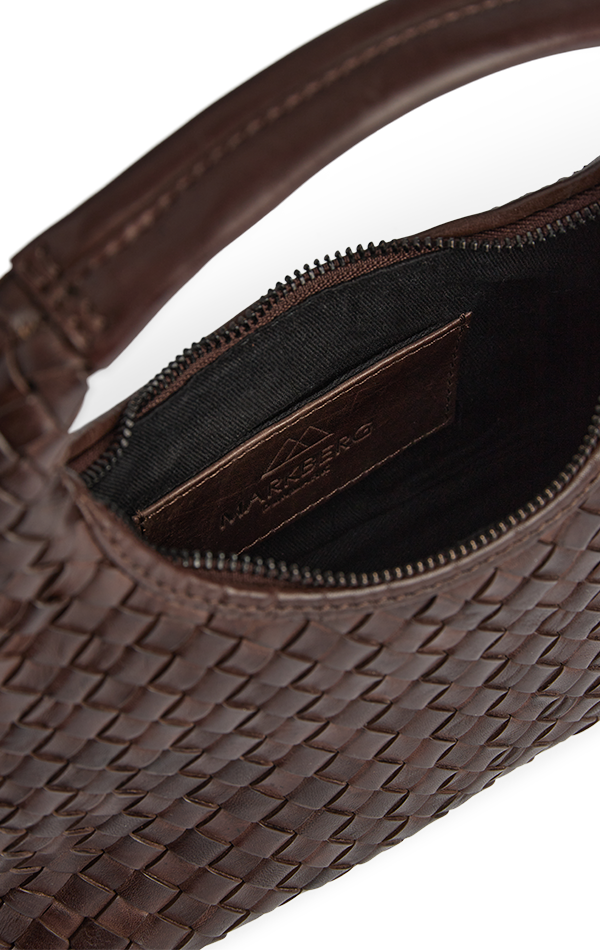 En kompakt håndtaske med håndflettet læder og elegant silhuet.