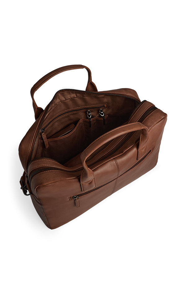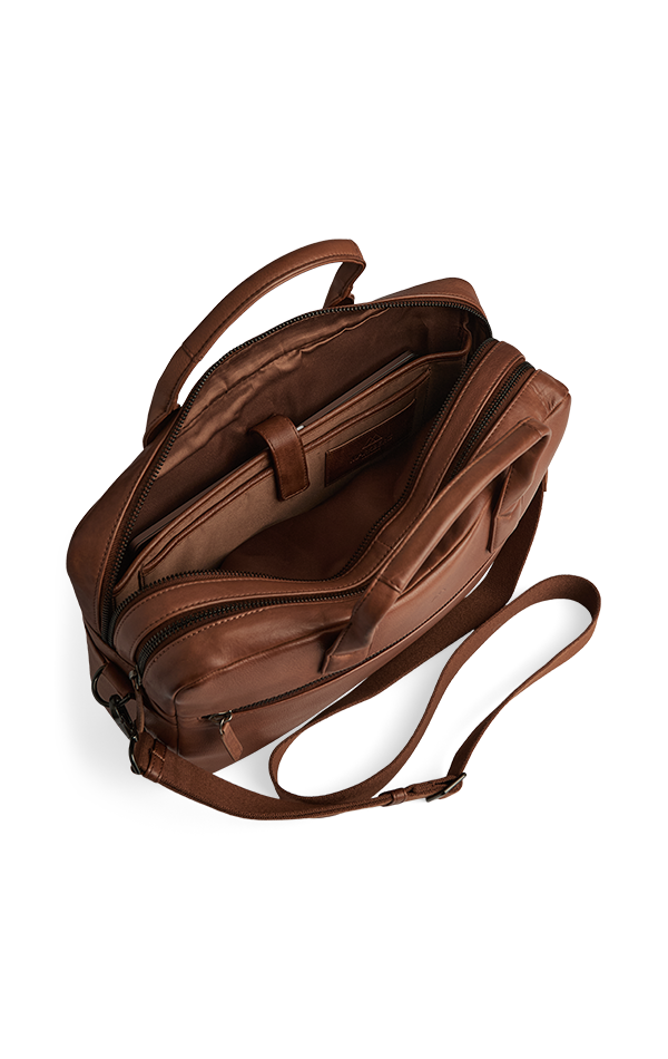 Tidløs og elegant arbejdstaske i blødt kalveskind. De to separate rum gør det nemt at organisere både computer, iPad og dokumenter – perfekt til både arbejde og rejser.